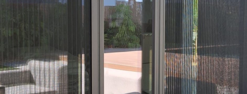 Instalación de mosquitera plisada de doble hoja con apertura lateral.